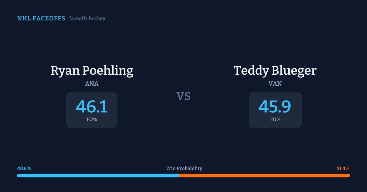 Blueger shoots left. Poehling is 49.9% vs left-shot opponents (505).