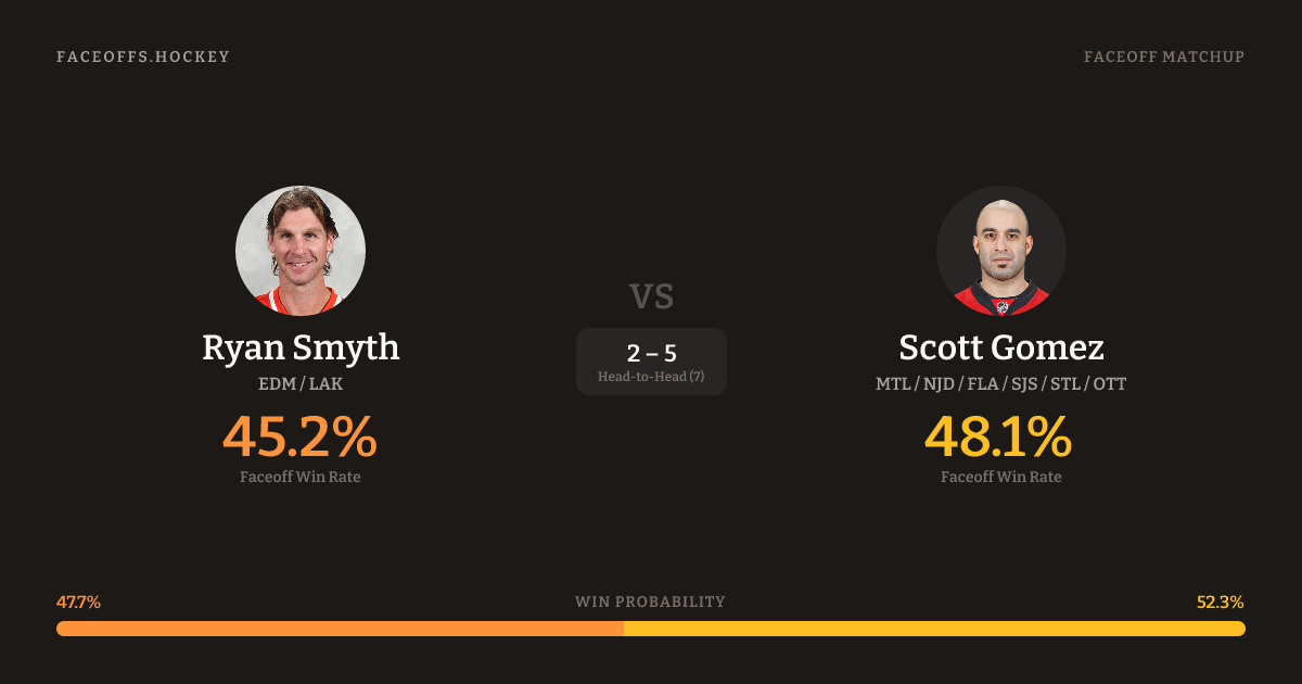 Scott Gomez holds a +12.8% FO% edge overall. Look for Gomez on neutral-zone draws (60% H2H, 5 meetings). Smyth wins 41.0% vs left-shot opponents — Gomez shoots left.