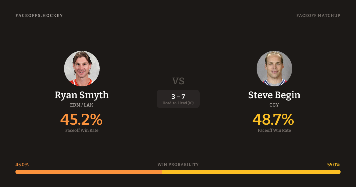 Steve Begin holds a +5.6% FO% edge overall. Look for Begin on offensive-zone draws (100% H2H, 4 meetings). Smyth wins 41.0% vs left-shot opponents — Begin shoots left.