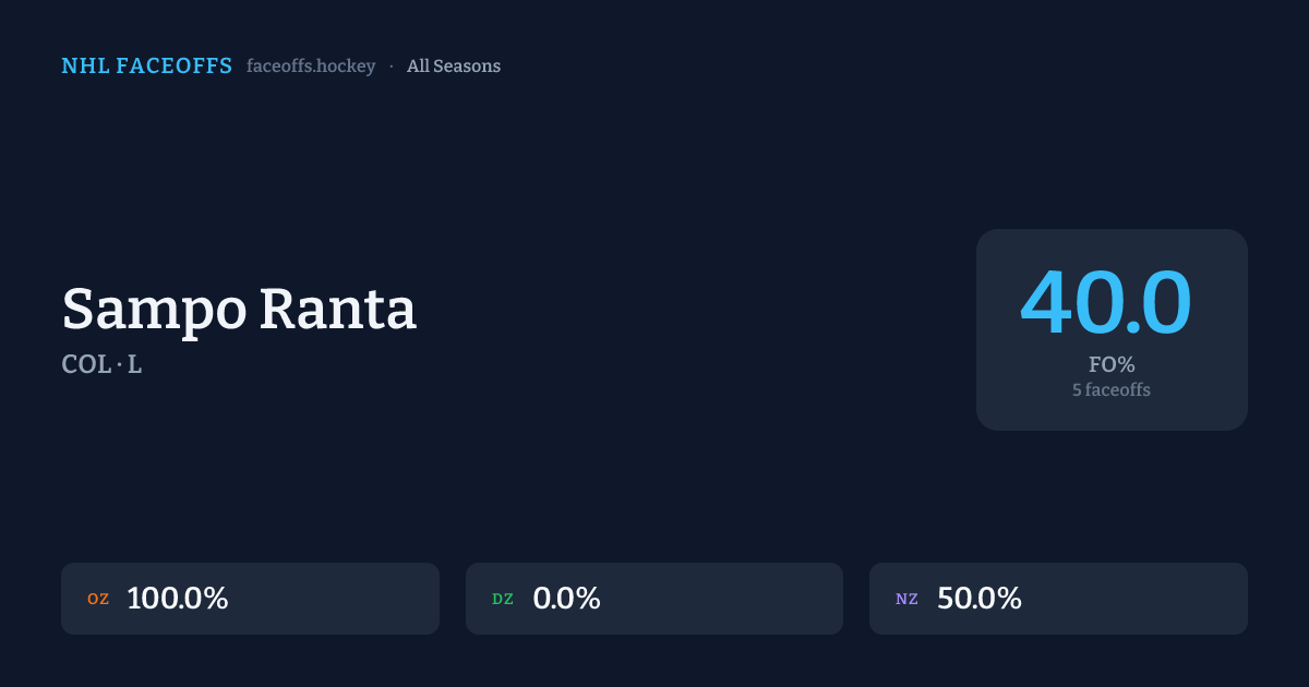 Sampo Ranta has a career faceoff win percentage of 40.0% across 5 faceoffs. Best zone: Offensive (100.0%).