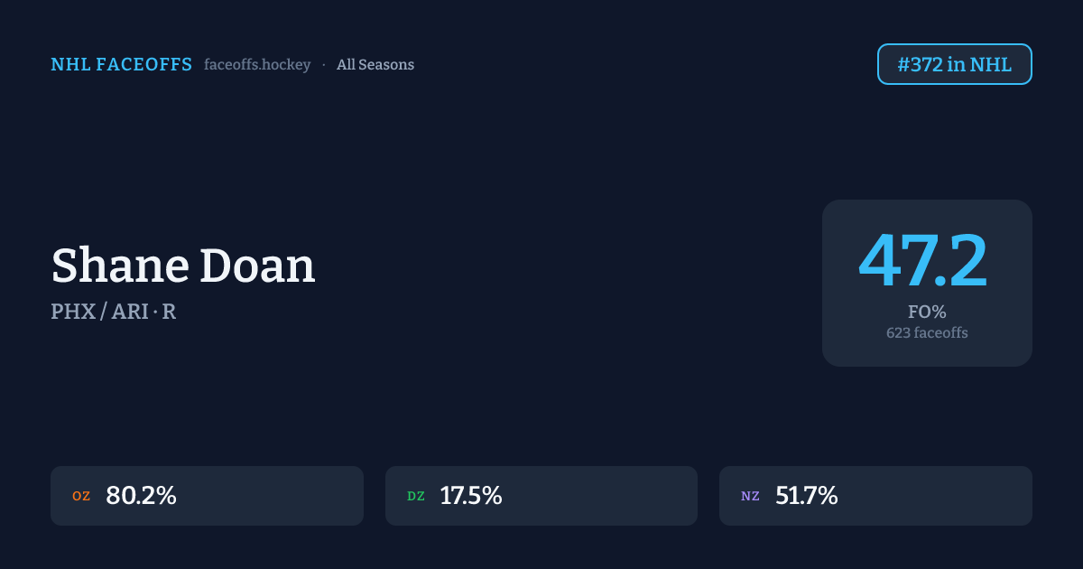 Shane Doan has a career faceoff win percentage of 47.2% across 623 faceoffs. Best zone: Offensive (80.2%). Ranked #372 in the league.