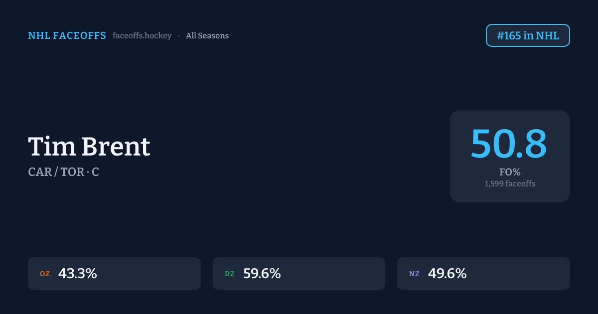 Tim Brent has a career faceoff win percentage of 50.8% across 1,599 faceoffs. Best zone: Defensive (59.6%). Ranked #165 in the league.