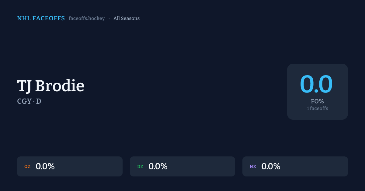 TJ Brodie has a career faceoff win percentage of 0.0% across 1 faceoffs. Best zone: Neutral (0.0%).