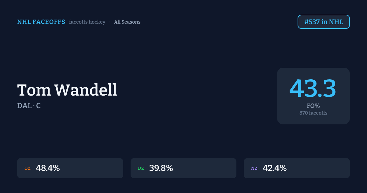 Tom Wandell has a career faceoff win percentage of 43.3% across 870 faceoffs. Best zone: Offensive (48.4%). Ranked #537 in the league.