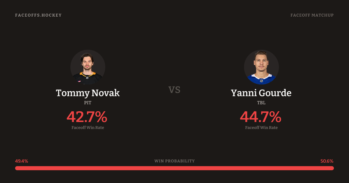 Yanni Gourde holds a +5.2% FO% edge overall. Look for Gourde on neutral-zone draws (67% H2H, 3 meetings). Novak wins 43.9% vs left-shot opponents — Gourde shoots left.