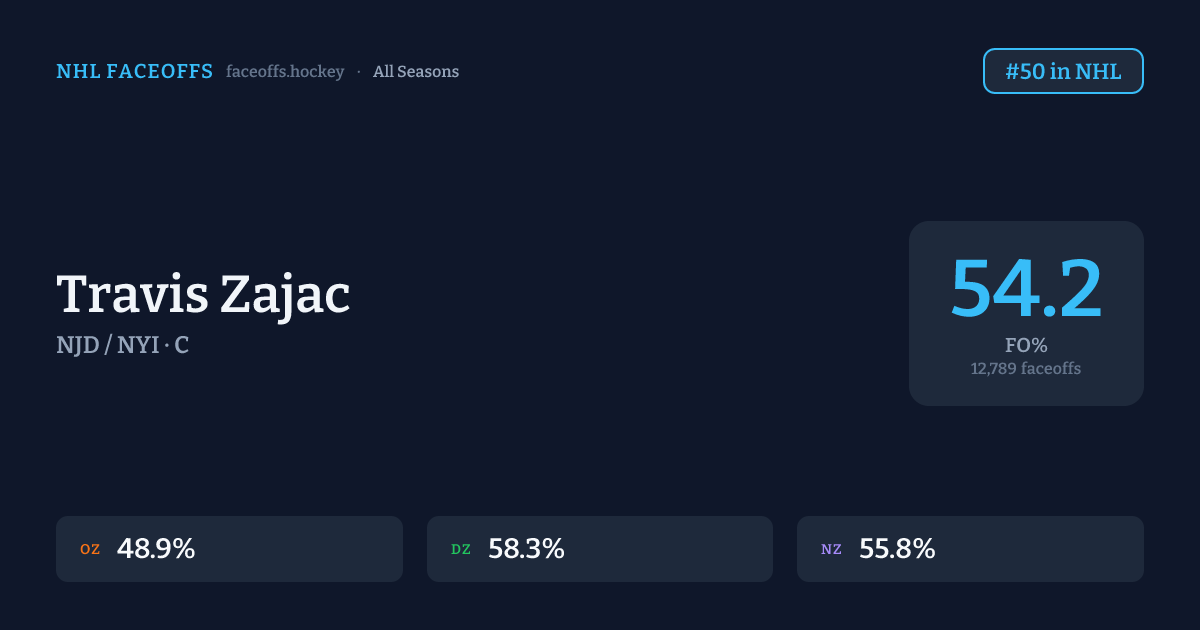 Travis Zajac has a career faceoff win percentage of 54.2% across 12,789 faceoffs. Best zone: Defensive (58.3%). Ranked #50 in the league.