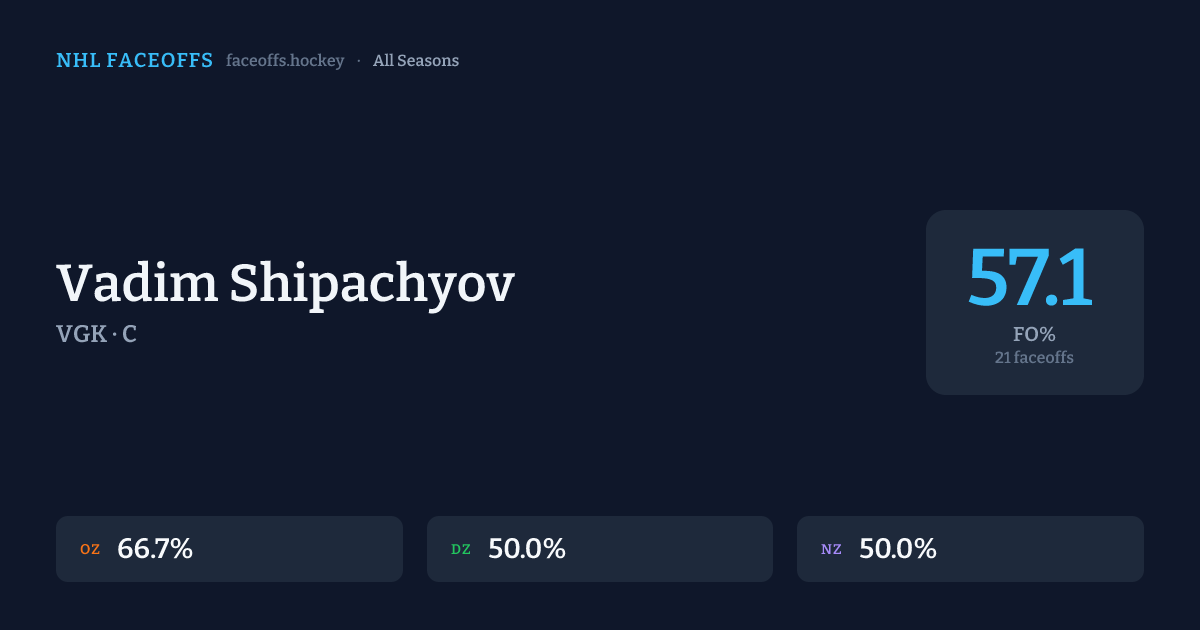 Vadim Shipachyov has a career faceoff win percentage of 57.1% across 21 faceoffs. Best zone: Offensive (66.7%).