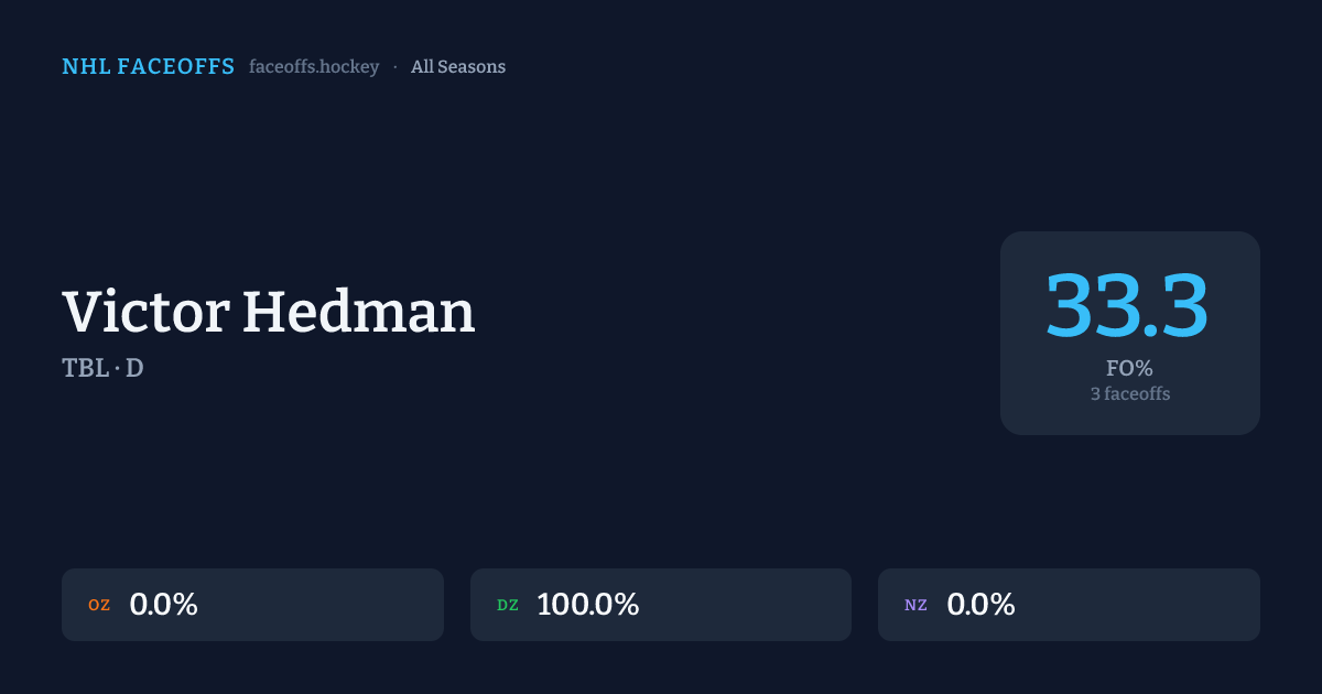 Victor Hedman has a 2018-19 faceoff win percentage of 0.0% across 1 faceoffs in the 2018-19 season. Best zone: Neutral (0.0%).