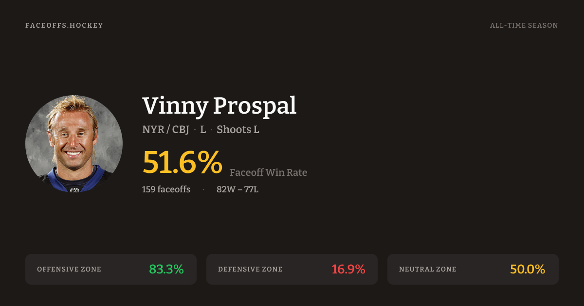 Vinny Prospal has a career faceoff win percentage of 50.9% across 165 faceoffs. Best zone: Offensive (83.8%).