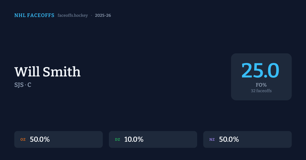 Will Smith has a 2025-26 faceoff win percentage of 25.0% across 32 faceoffs in the 2025-26 season. Best zone: Neutral (50.0%).