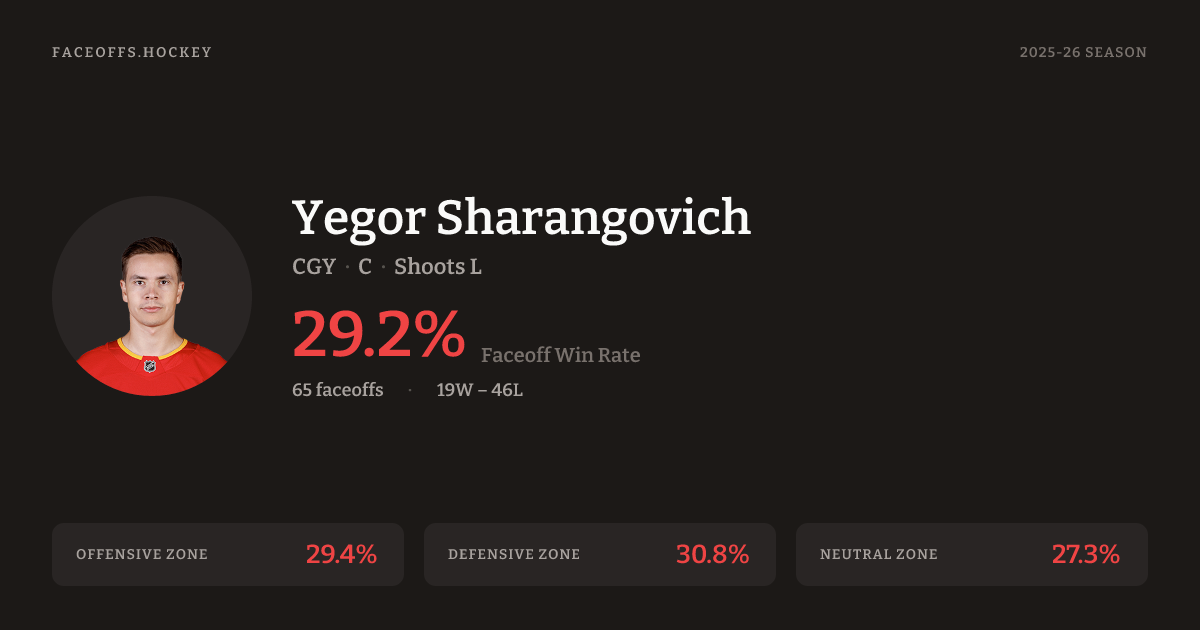 Yegor Sharangovich has a 2025-26 faceoff win percentage of 29.2% across 65 faceoffs in the 2025-26 season. Best zone: Defensive (30.8%).