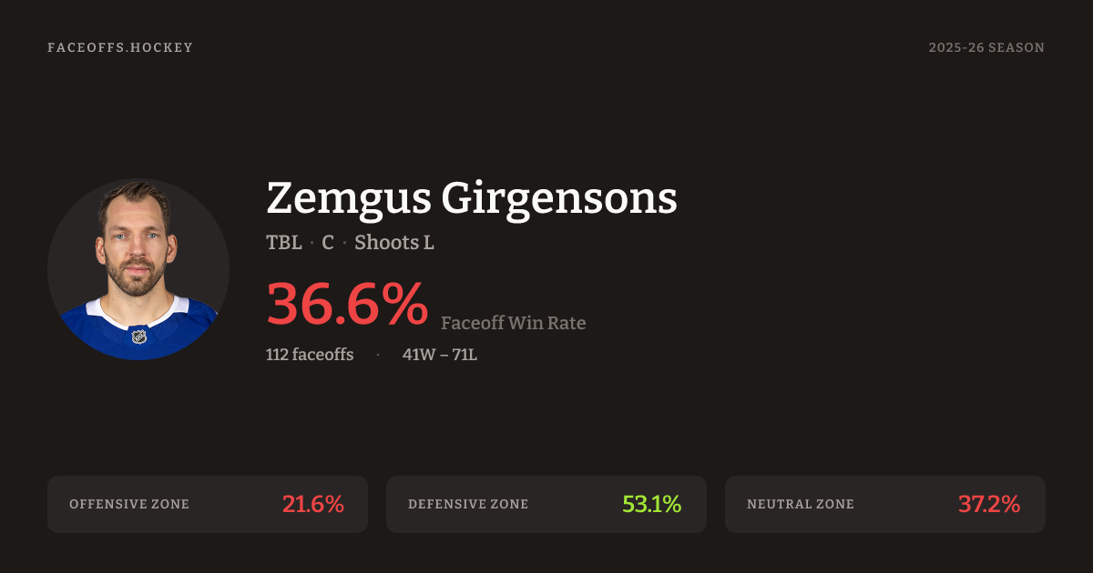 | 2025-26 | Tampa Bay Lightning | 30 | 36.6% | 41 | 112 | 21.6% | 53.1% | 37.2% |