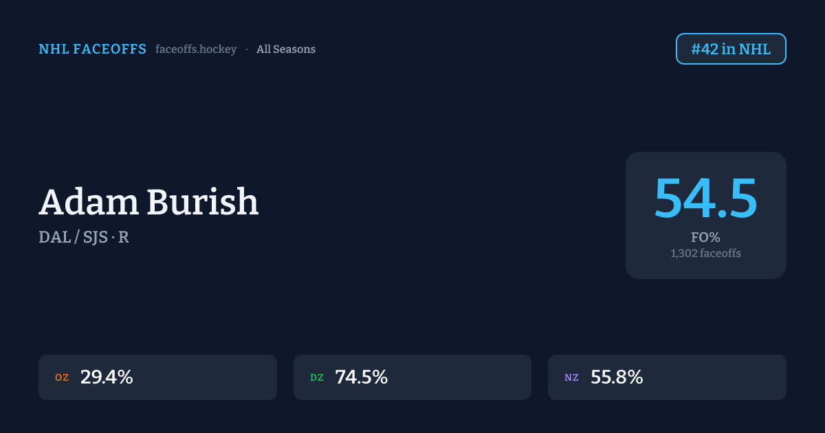 Adam Burish has a career faceoff win percentage of 54.5% across 1,302 faceoffs. Best zone: Defensive (74.5%). Ranked #42 in the league.