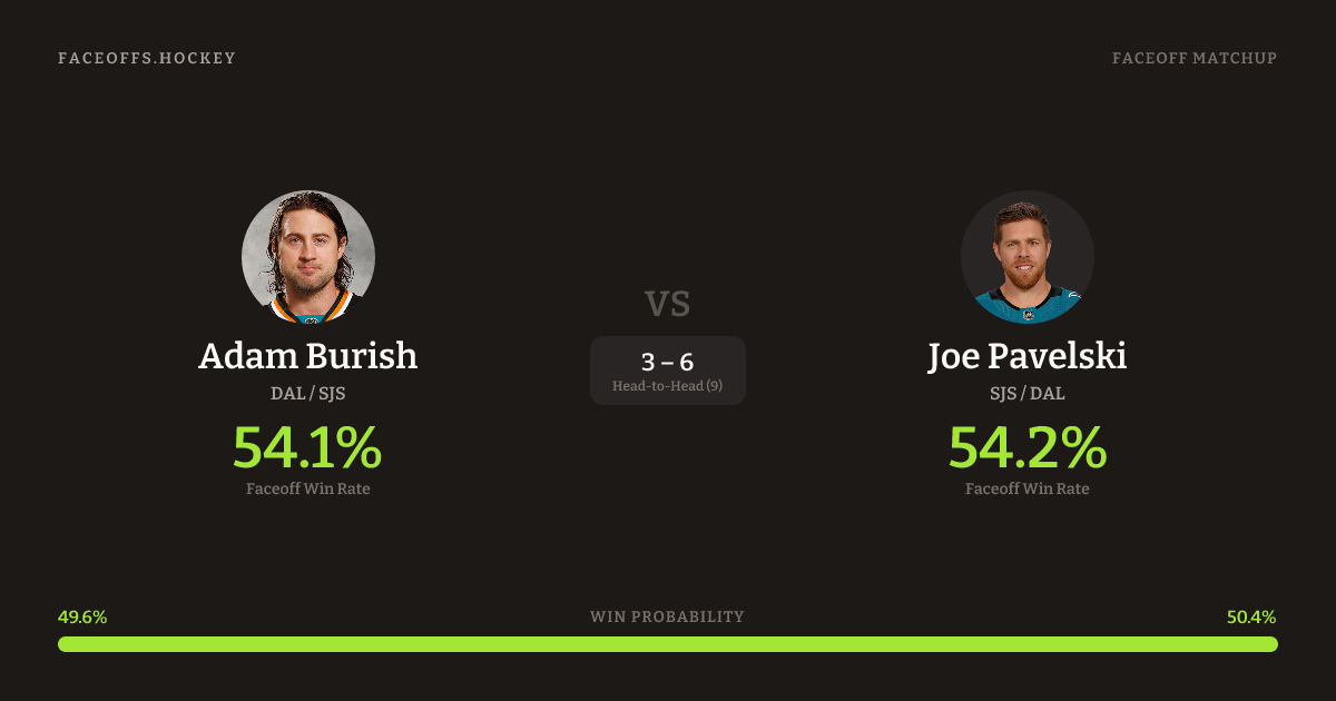 These two are closely matched in overall FO% (53.5% vs 54.3%). Look for Burish on defensive-zone draws (60% H2H, 5 meetings). Burish wins 61.9% vs right-shot opponents — Pavelski shoots right.
