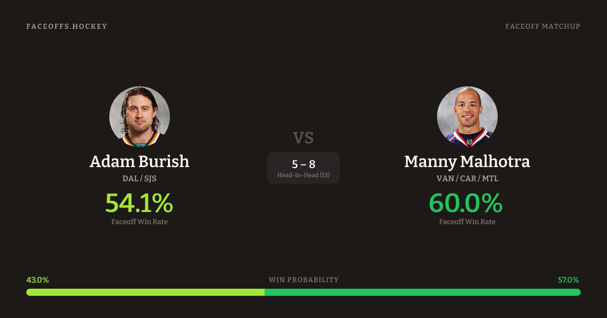 Manny Malhotra holds a +2.7% FO% edge overall. Look for Malhotra on defensive-zone draws (100% H2H, 4 meetings). Burish wins 55.2% vs left-shot opponents — Malhotra shoots left.