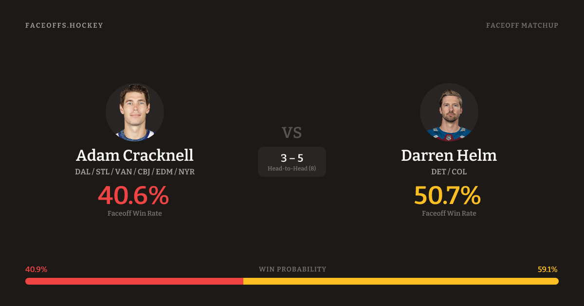 Darren Helm holds a +13.6% FO% edge overall. Cracknell wins 34.0% vs left-shot opponents — Helm shoots left.