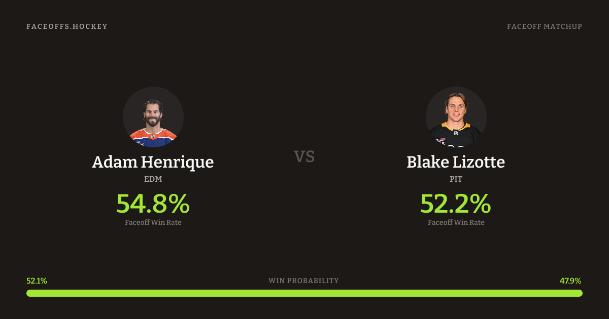 Adam Henrique holds a +4.6% FO% edge overall. Henrique wins 55.2% vs left-shot opponents — Lizotte shoots left.
