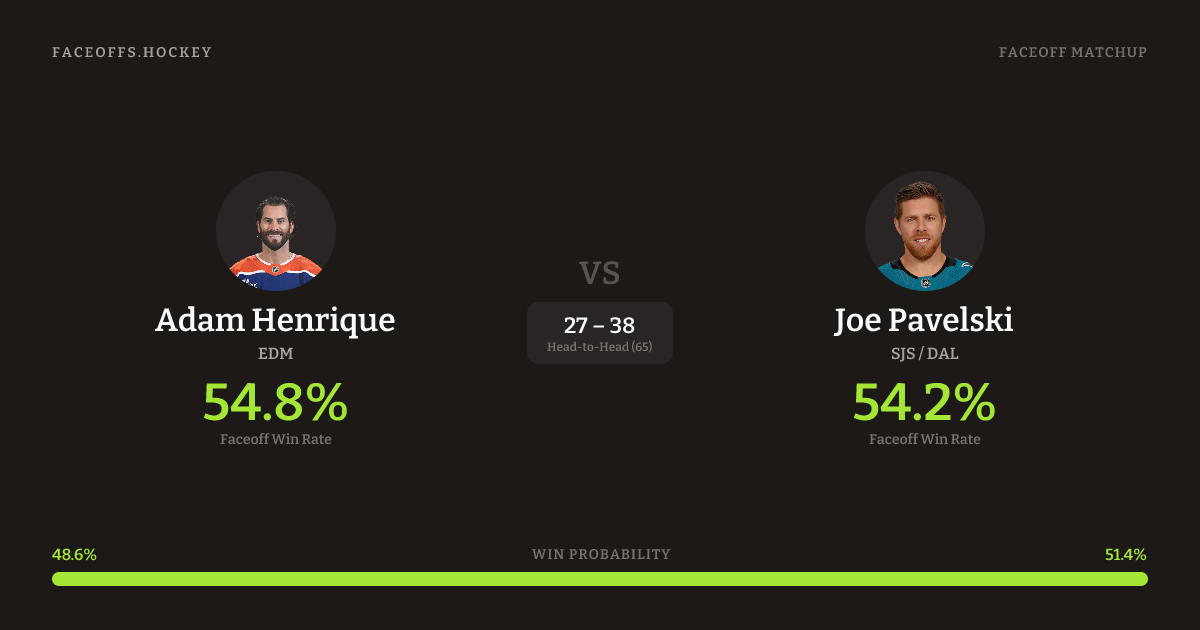 Joe Pavelski holds a +11.7% FO% edge overall. Look for Pavelski on defensive-zone draws (100% H2H, 3 meetings). Henrique wins 42.1% vs right-shot opponents — Pavelski shoots right.