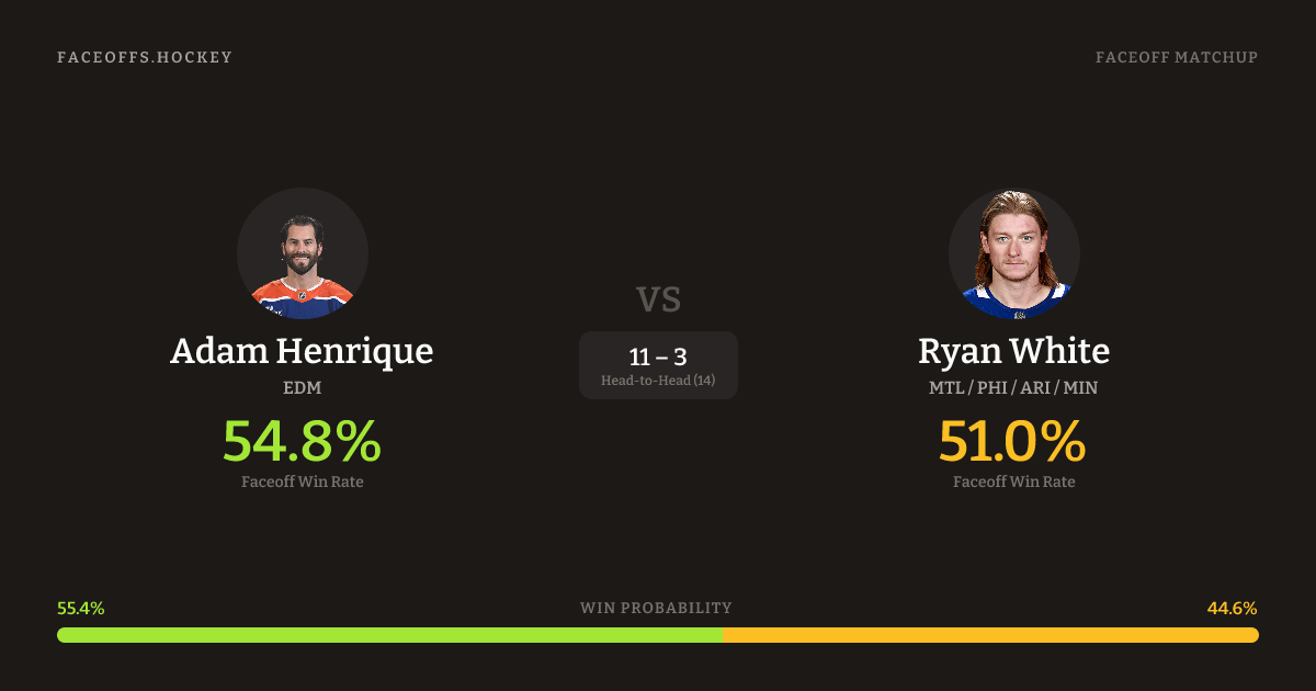 Ryan White holds a +7.7% FO% edge overall. Look for Henrique on offensive-zone draws (80% H2H, 5 meetings). Henrique wins 43.3% vs right-shot opponents — White shoots right.