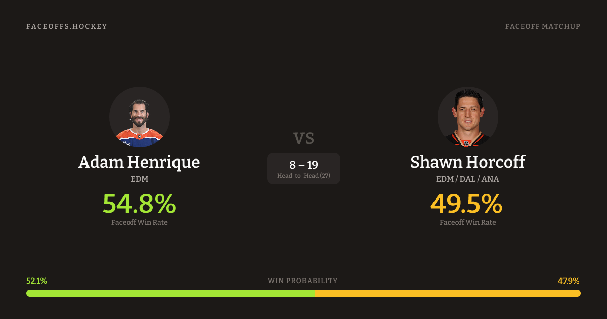 Shawn Horcoff holds a +5.8% FO% edge overall. Look for Horcoff on defensive-zone draws (67% H2H, 3 meetings). Henrique wins 45.9% vs left-shot opponents — Horcoff shoots left.