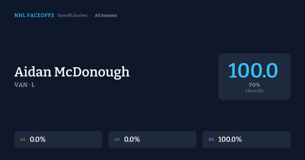 Aidan McDonough has a 2022-23 faceoff win percentage of 100.0% across 1 faceoffs in the 2022-23 season. Best zone: Neutral (100.0%).