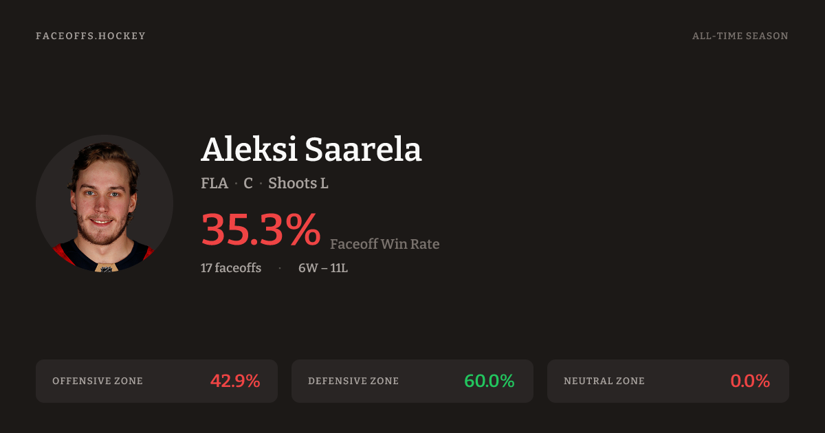 Aleksi Saarela has a career faceoff win percentage of 35.3% across 17 faceoffs. Best zone: Defensive (60.0%).