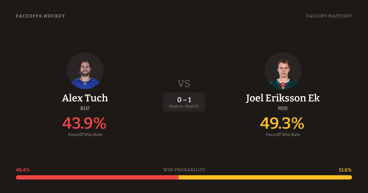 Joel Eriksson Ek holds a +9.6% FO% edge overall. Look for Ek on defensive-zone draws (100% H2H, 3 meetings). Tuch wins 37.0% vs left-shot opponents — Ek shoots left.