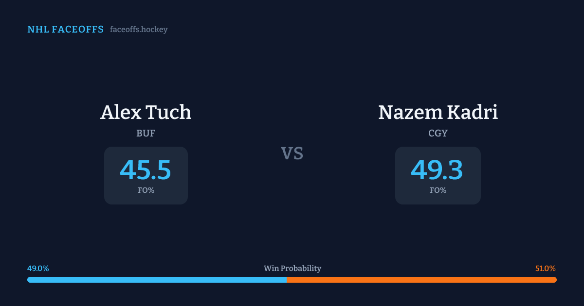 Nazem Kadri holds a +5.2% FO% edge overall. Look for Kadri on offensive-zone draws (67% H2H, 3 meetings). Tuch wins 40.5% vs left-shot opponents — Kadri shoots left.