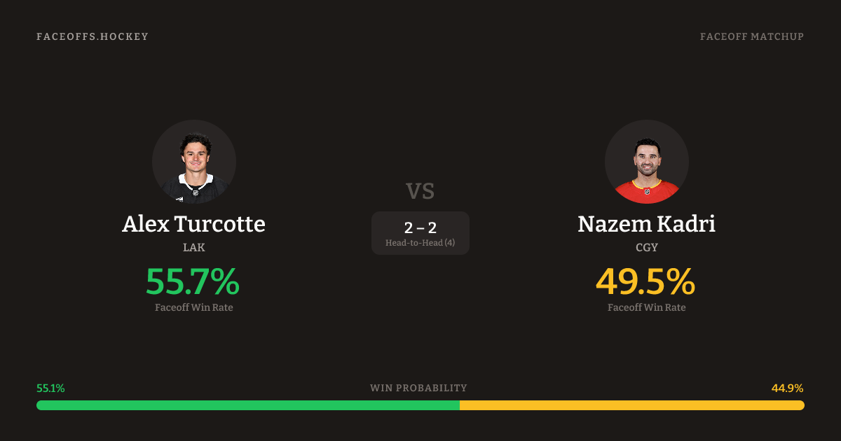 These two are closely matched in overall FO% (45.5% vs 46.2%). Look for Turcotte on neutral-zone draws (100% H2H, 4 meetings).