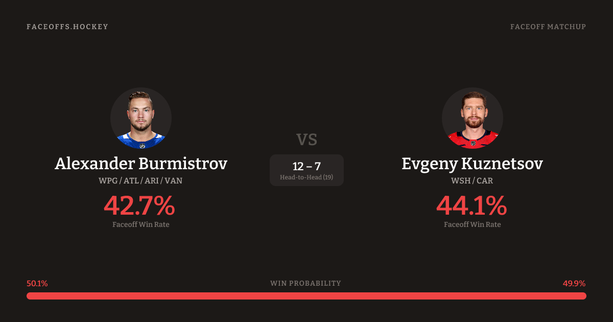 Evgeny Kuznetsov holds a +3.3% FO% edge overall. Look for Burmistrov on neutral-zone draws (67% H2H, 6 meetings). Burmistrov wins 44.1% vs left-shot opponents — Kuznetsov shoots left.
