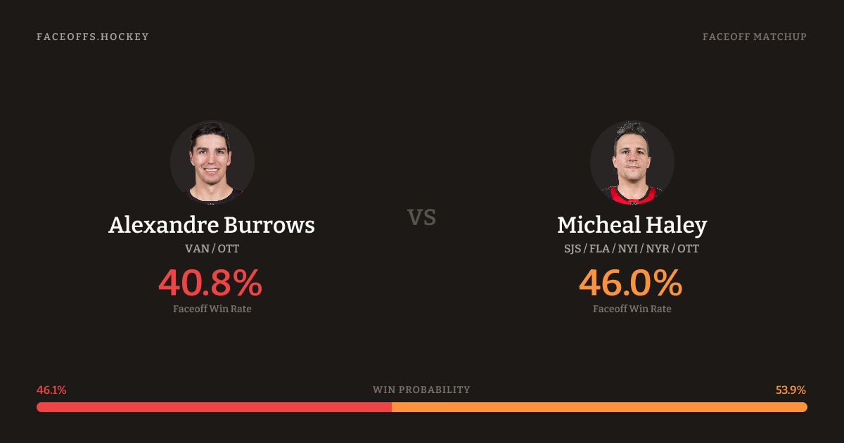 Micheal Haley holds a +5.2% FO% edge overall. Burrows wins 42.5% vs left-shot opponents — Haley shoots left.