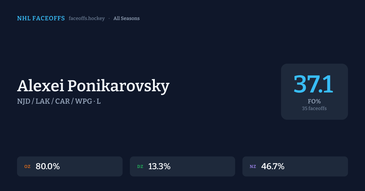 Alexei Ponikarovsky has a 2011-12 faceoff win percentage of 35.3% across 17 faceoffs in the 2011-12 season. Best zone: Neutral (55.6%).