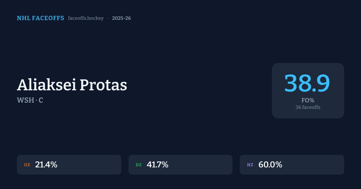 Aliaksei Protas has a 2025-26 faceoff win percentage of 38.9% across 36 faceoffs in the 2025-26 season. Best zone: Neutral (60.0%).