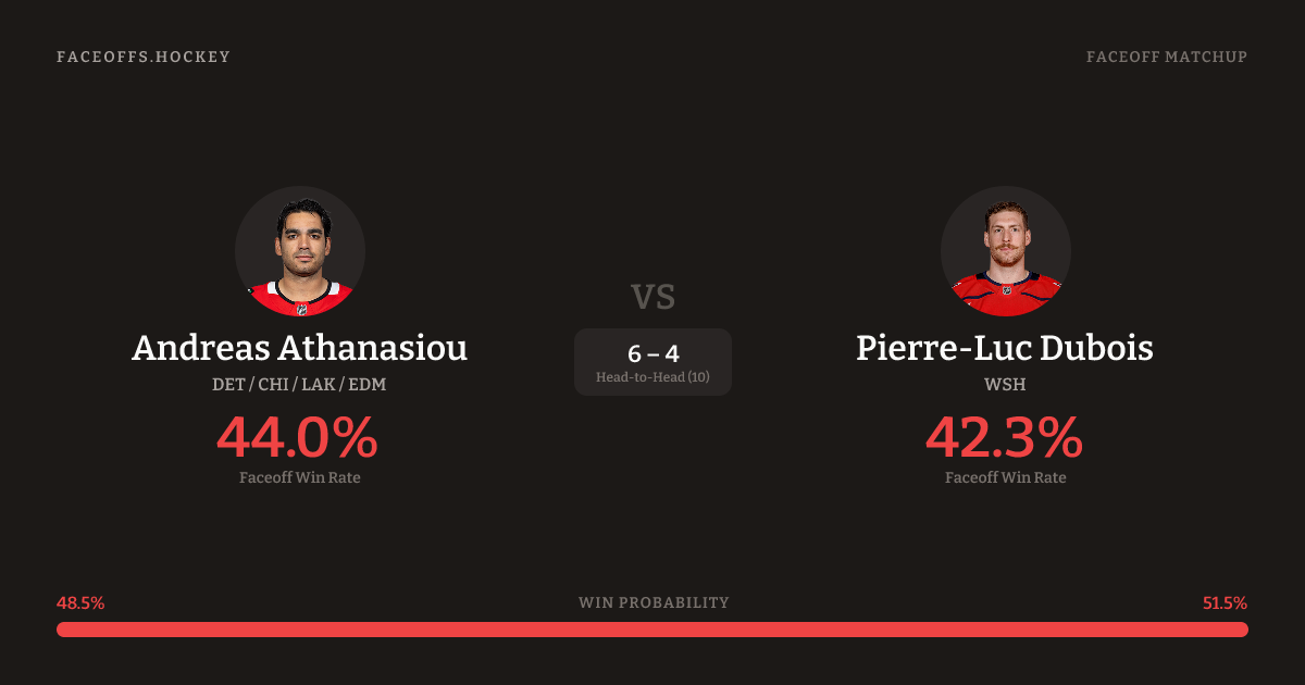Pierre-Luc Dubois holds a +3.4% FO% edge overall. Look for Dubois on neutral-zone draws (67% H2H, 3 meetings).