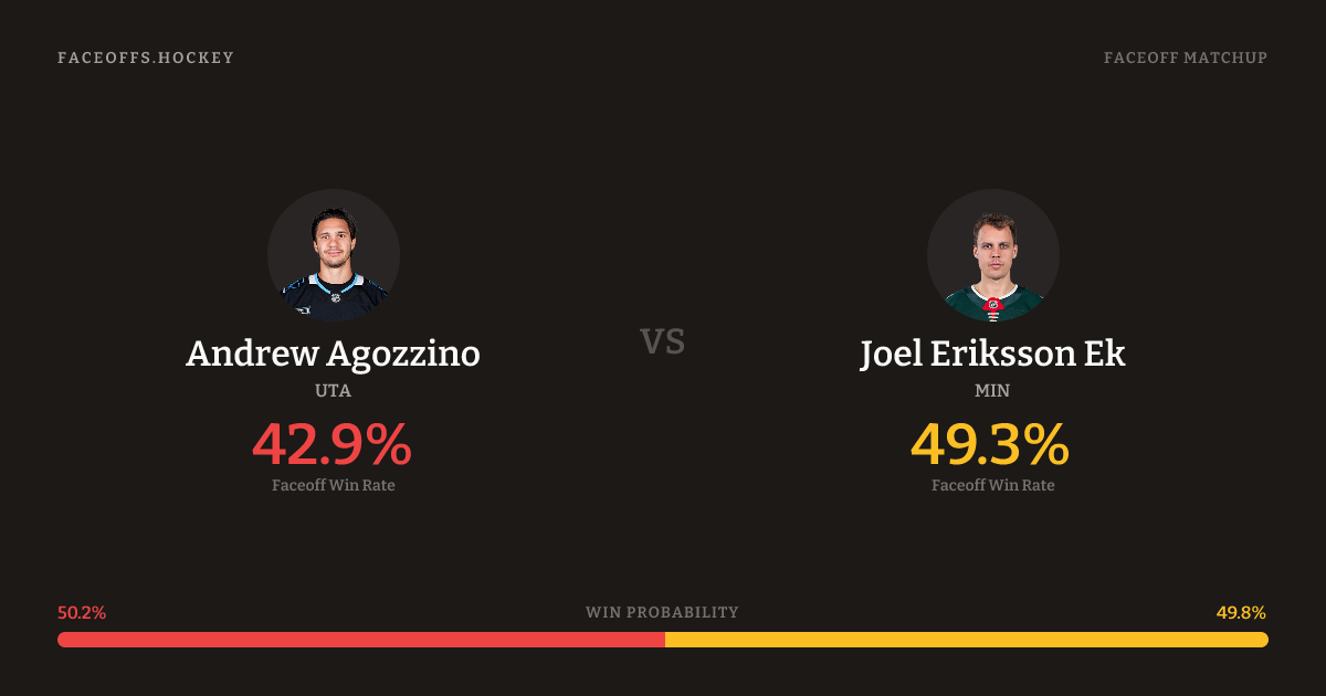 Ek shoots left. Agozzino is 51.2% vs left-shot opponents (41).