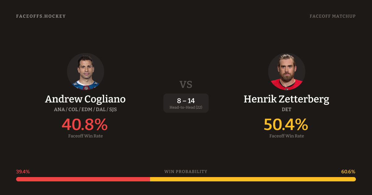 Henrik Zetterberg holds a +9.6% FO% edge overall. Look for Zetterberg on offensive-zone draws (71% H2H, 7 meetings). Cogliano wins 39.6% vs left-shot opponents — Zetterberg shoots left.