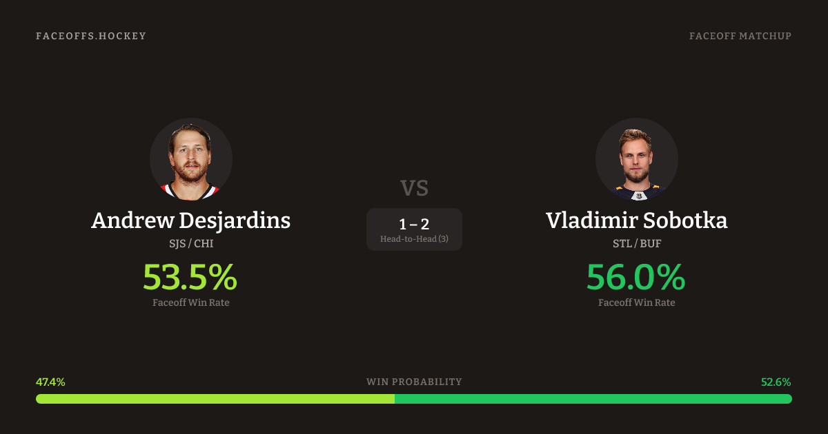 Sobotka shoots left. Desjardins is 51.7% vs left-shot opponents (265).