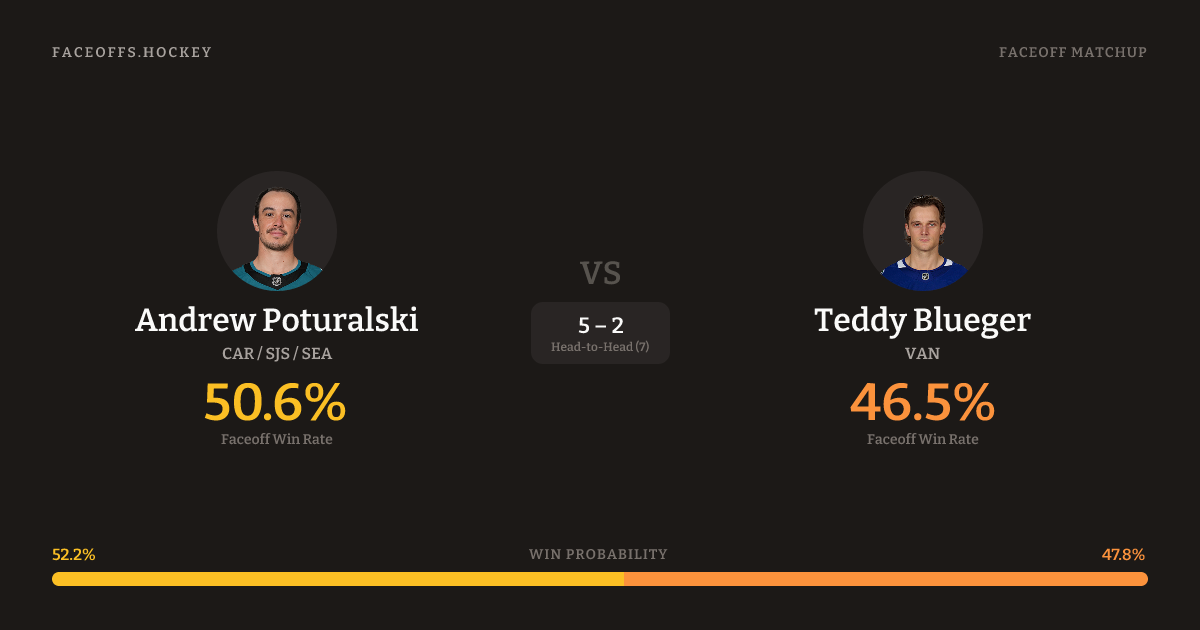 Teddy Blueger holds a +1.4% FO% edge overall. Look for Poturalski on neutral-zone draws (75% H2H, 4 meetings). Poturalski wins 62.5% vs left-shot opponents — Blueger shoots left.