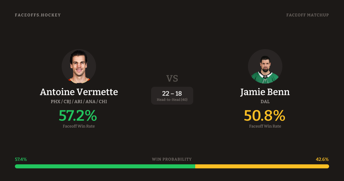 Antoine Vermette holds a +3.6% FO% edge overall. Look for Benn on offensive-zone draws (83% H2H, 6 meetings). Vermette wins 55.0% vs left-shot opponents — Benn shoots left.