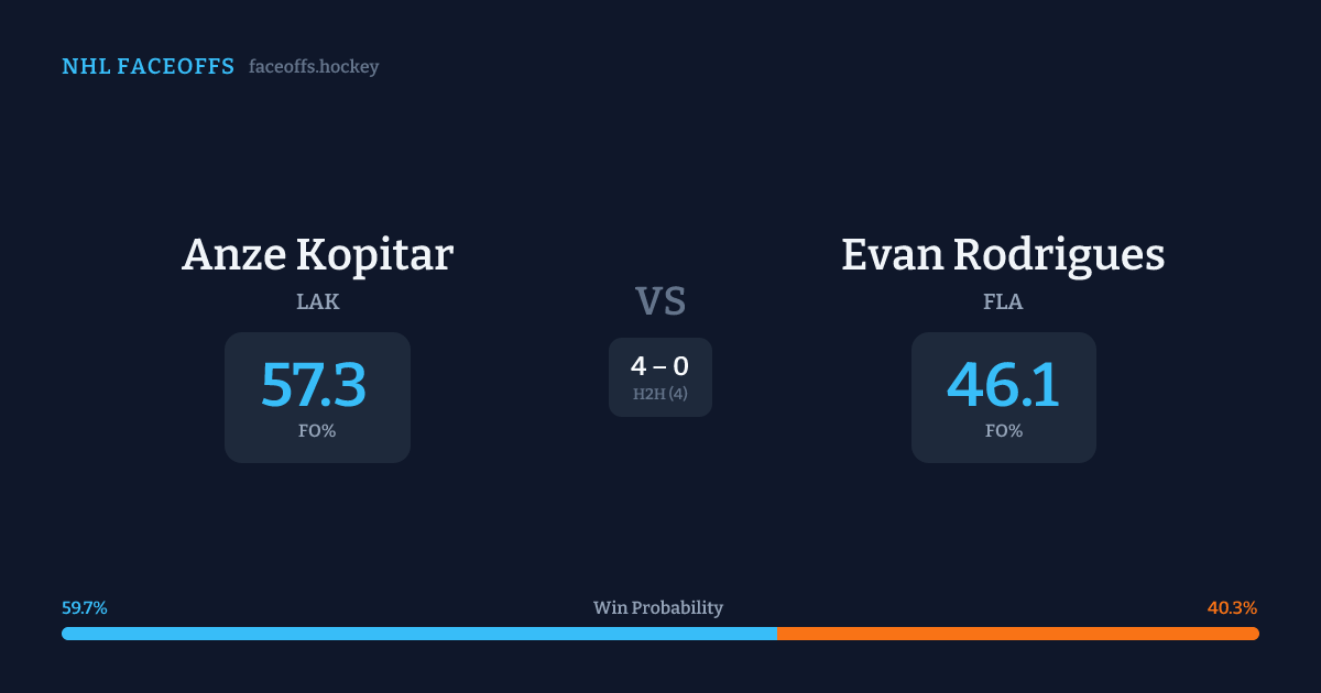 Anze Kopitar holds a +8.7% FO% edge overall. Look for Rodrigues on offensive-zone draws (75% H2H, 4 meetings). Kopitar wins 53.8% vs right-shot opponents — Rodrigues shoots right.