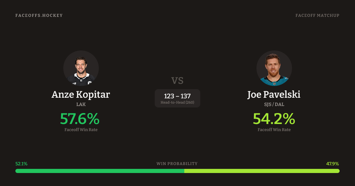 Anze Kopitar holds a +4.0% FO% edge overall. Look for Kopitar on offensive-zone draws (86% H2H, 7 meetings). Kopitar wins 56.0% vs right-shot opponents — Pavelski shoots right.