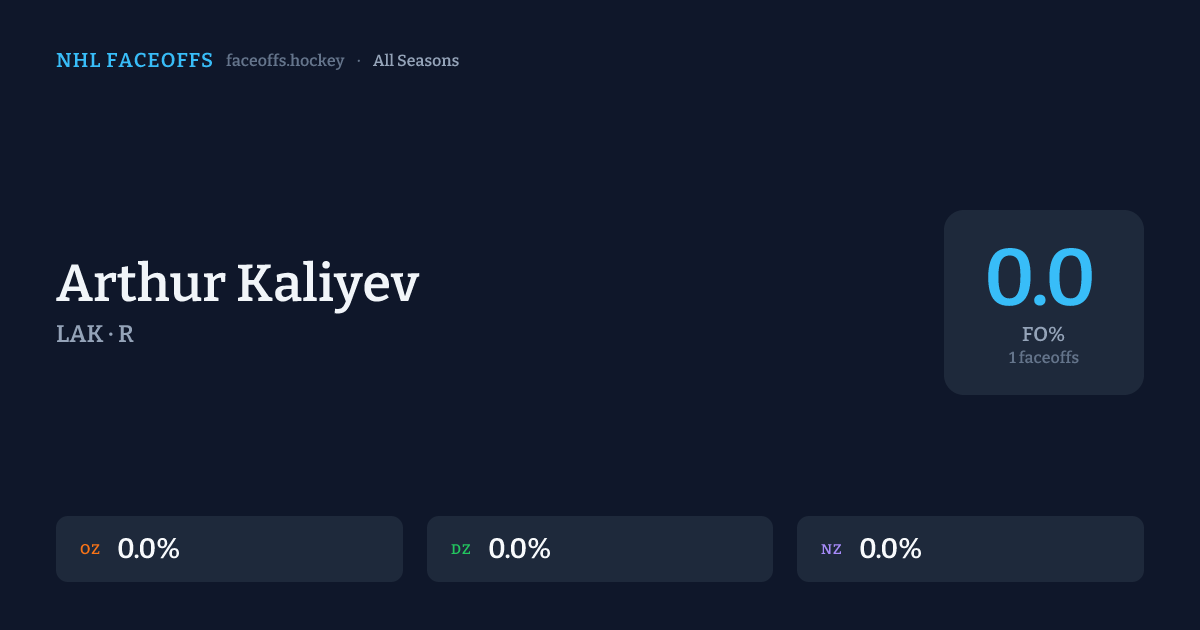 Arthur Kaliyev has a 2023-24 faceoff win percentage of 0.0% across 1 faceoffs in the 2023-24 season. Best zone: Neutral (0.0%).