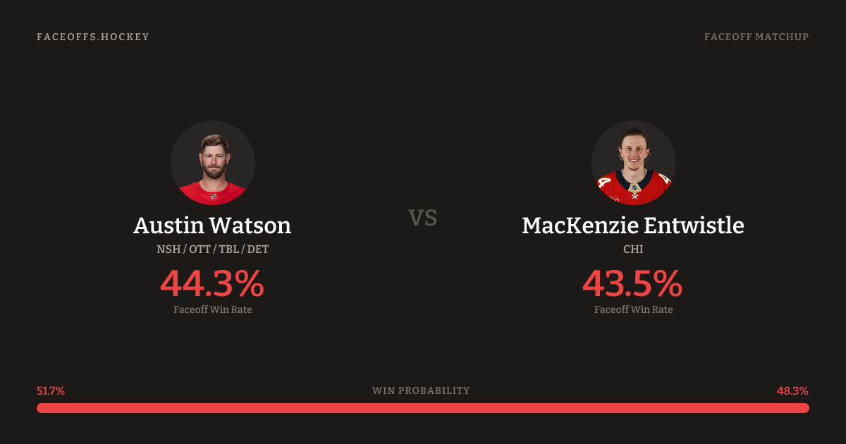 These two are closely matched in overall FO% (44.3% vs 43.5%). Watson wins 36.1% vs right-shot opponents — Entwistle shoots right.