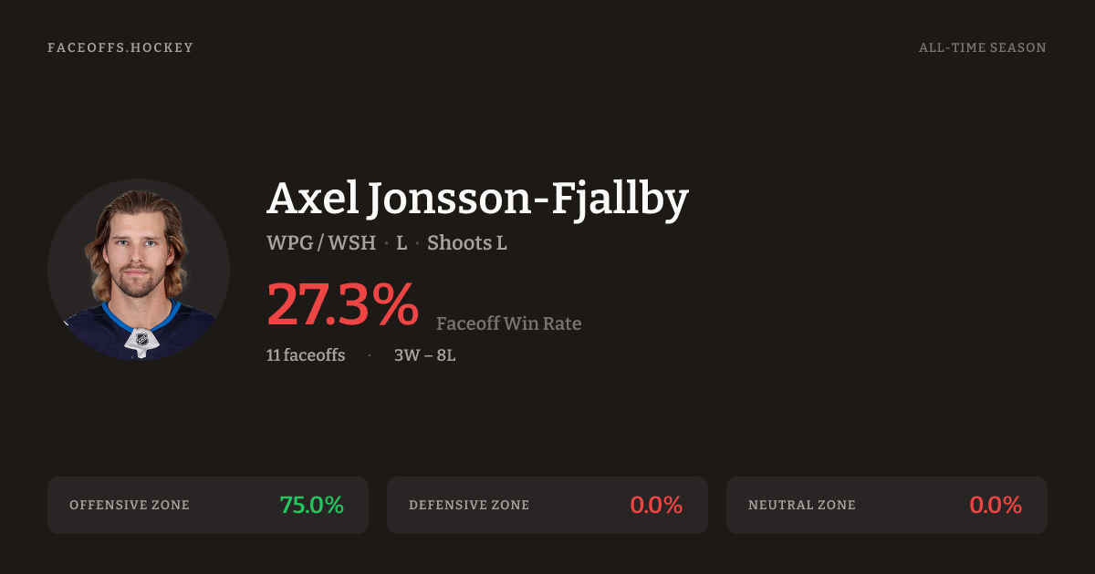 Axel Jonsson-Fjallby has a 2021-22 faceoff win percentage of 25.0% across 4 faceoffs in the 2021-22 season. Best zone: Offensive (100.0%).