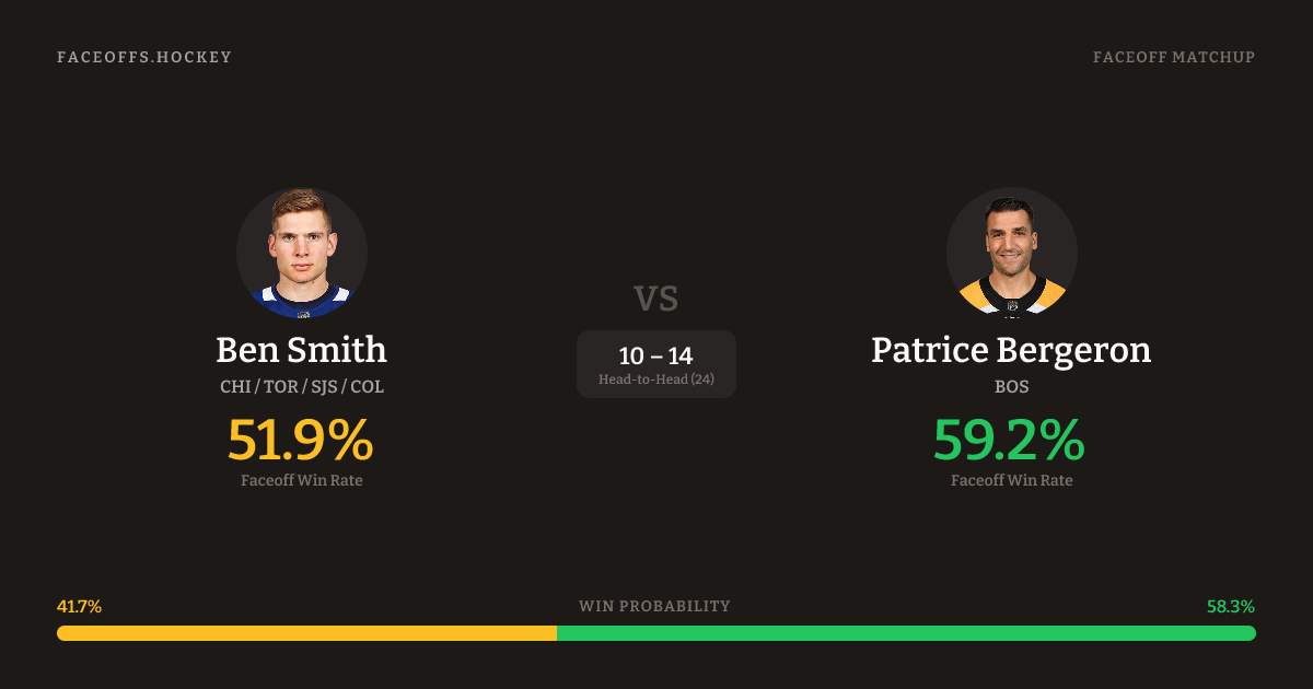 Smith shoots right. Bergeron is 56.3% vs right-shot opponents (613).