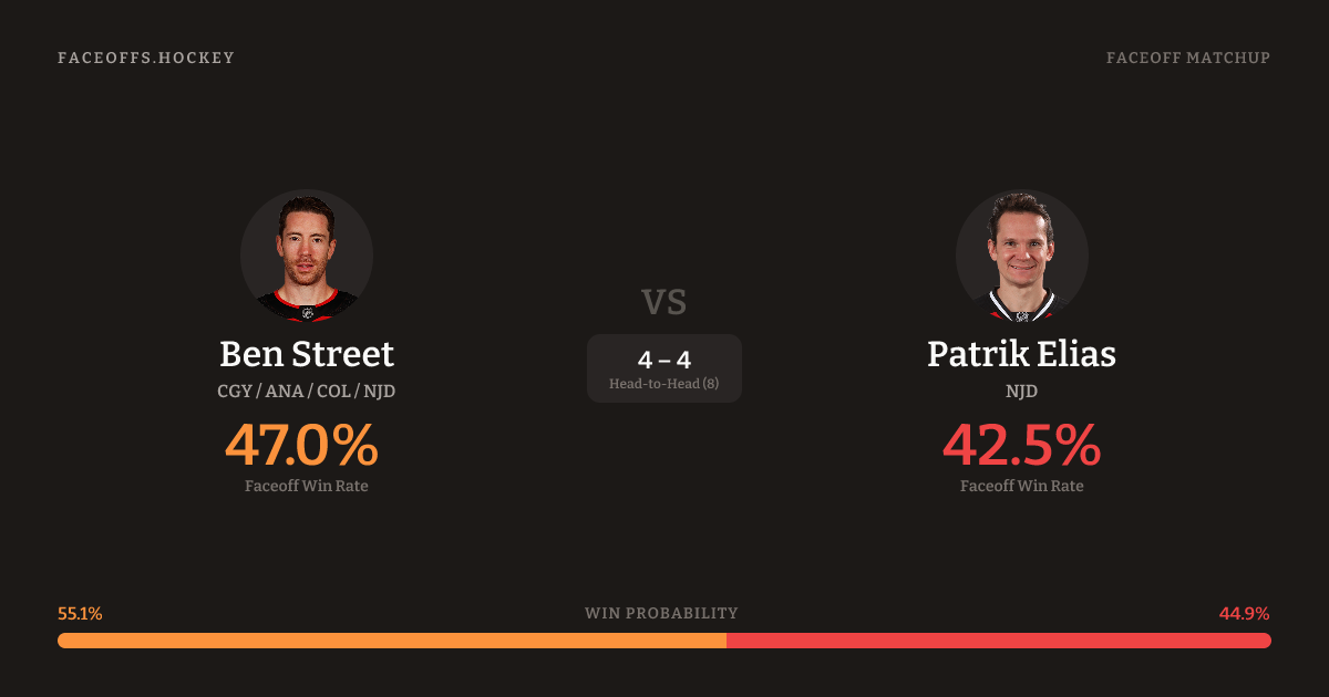 Ben Street holds a +5.2% FO% edge overall. Look for Elias on neutral-zone draws (75% H2H, 4 meetings). Street wins 38.5% vs left-shot opponents — Elias shoots left.