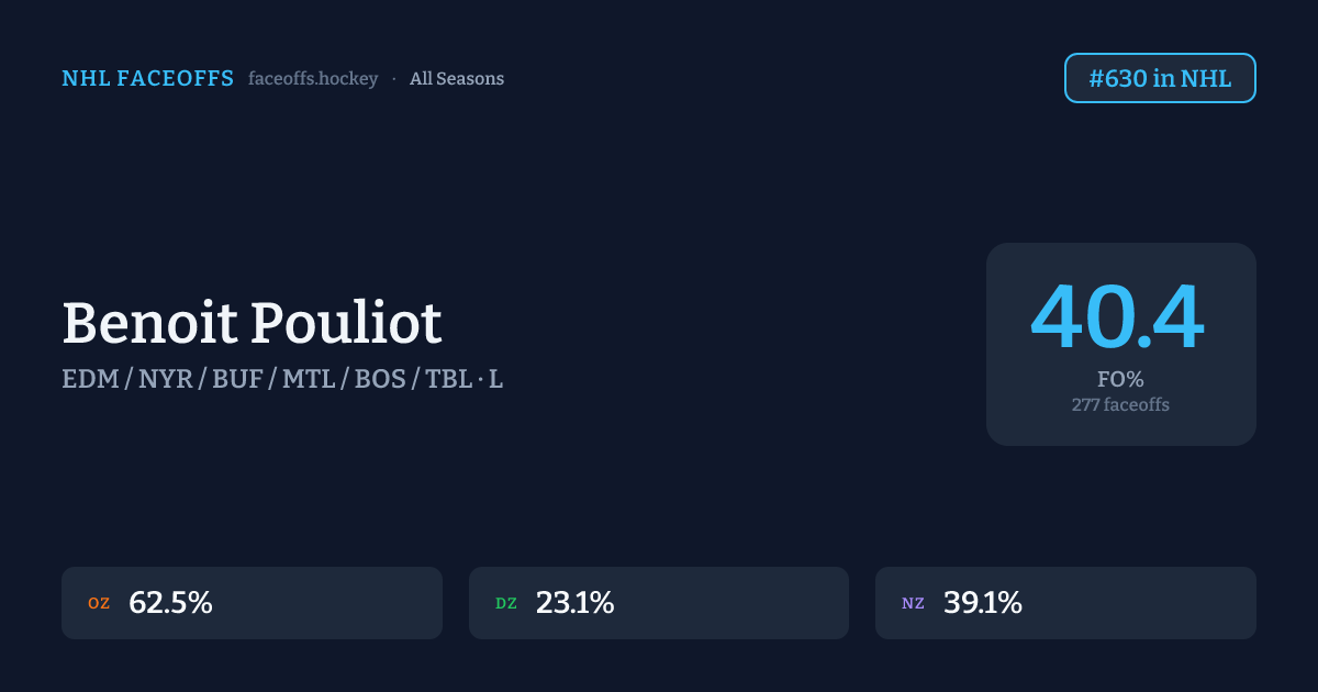 Benoit Pouliot has a career faceoff win percentage of 40.4% across 277 faceoffs. Best zone: Offensive (62.5%). Ranked #630 in the league.