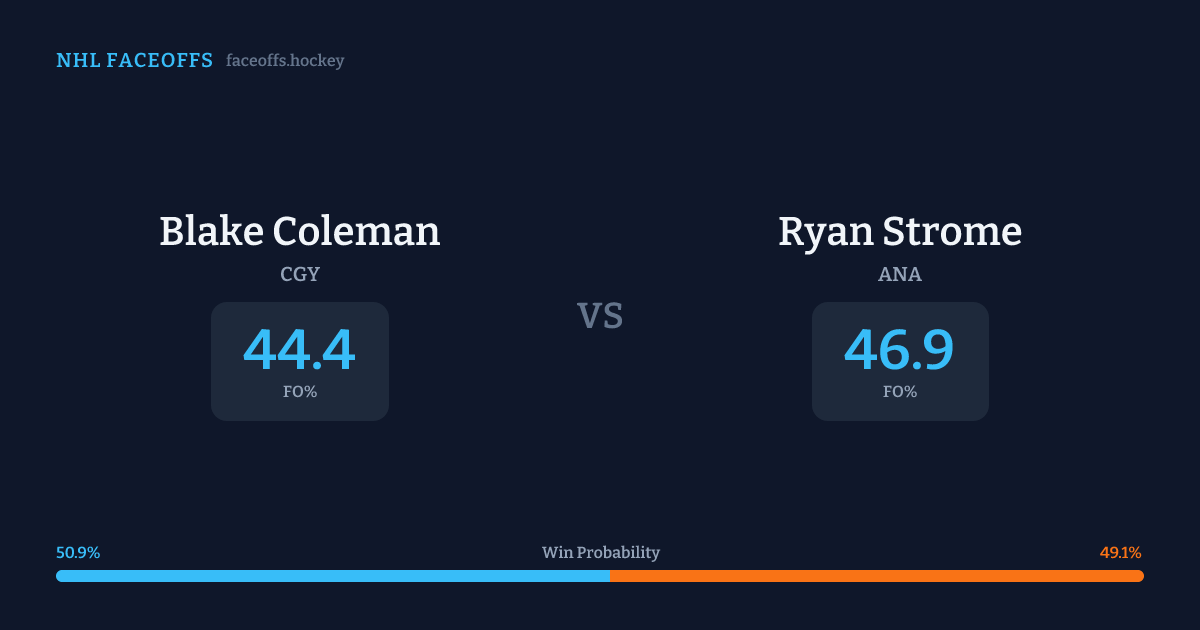 Ryan Strome holds a +6.0% FO% edge overall. Look for Strome on offensive-zone draws (60% H2H, 5 meetings). Coleman wins 37.6% vs right-shot opponents — Strome shoots right.
