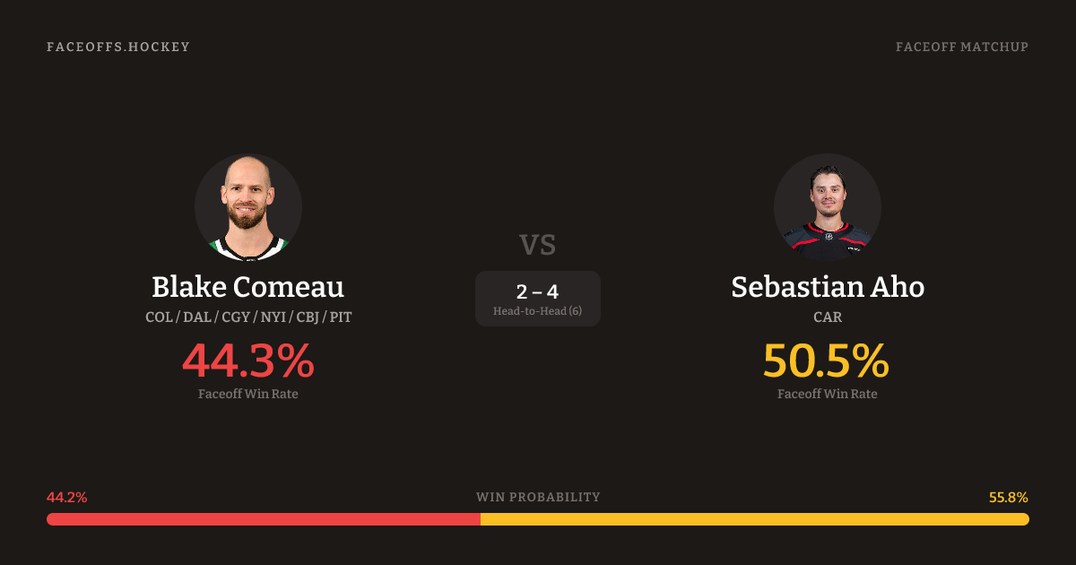 Sebastian Aho holds a +4.5% FO% edge overall. Look for Aho on offensive-zone draws (67% H2H, 3 meetings). Comeau wins 45.7% vs left-shot opponents — Aho shoots left.
