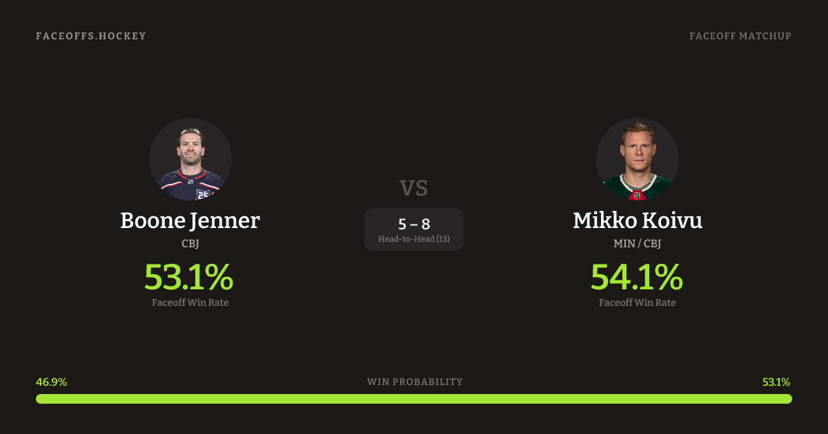 These two are closely matched in overall FO% (54.0% vs 54.1%). Look for Koivu on offensive-zone draws (80% H2H, 5 meetings). Jenner wins 54.1% vs left-shot opponents — Koivu shoots left.
